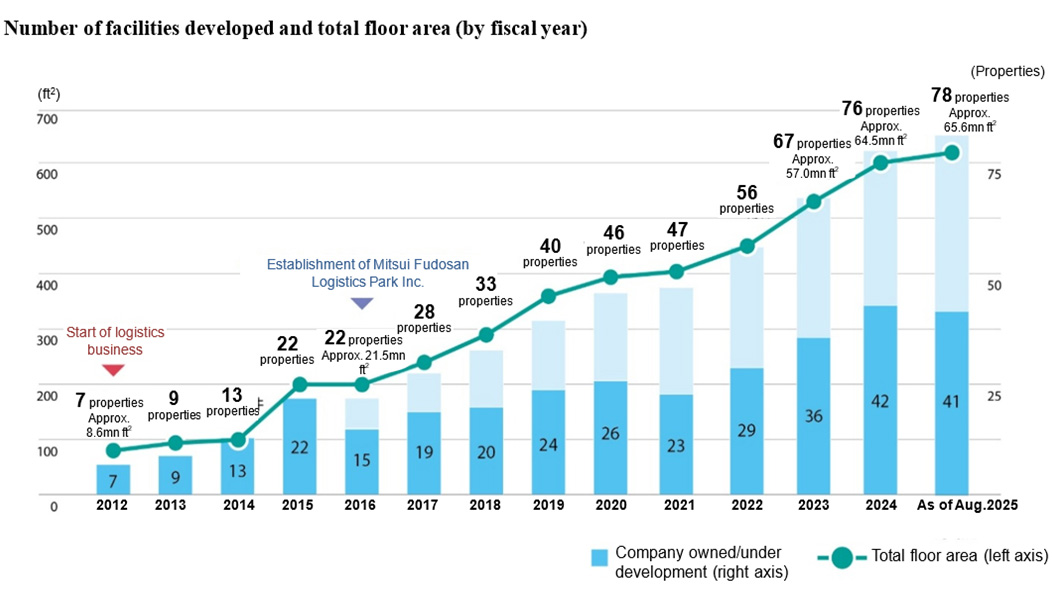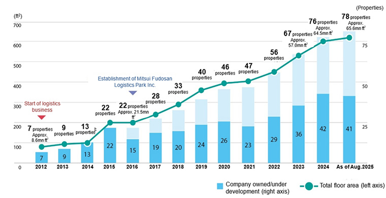 As of August 2025, the Company’s logistics business is developing and operating a total of 78 facilities (68 in Japan and 10 overseas), with a total floor area of approximately 65,659,854 ft2 (approximately 6.10 million m2). The cumulative total investment amount has expanded to approximately ¥1.3000 trillion yen. Going forward, the Company will continue to leverage the know-how and expertise it has accumulated to date and steadily develop the business.