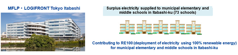 MFLP・LOGIFRONT Tokyo Itabashi promotes advanced environmentally conscious initiatives, such as supplying surplus electricity from approximately 4 MW of solar power generation equipment installed on the entire roof of the facility to local government facilities (off-site PPA). MFLP Iruma I has realized a self-supply system by enhancing its emergency power generators and solar power generation facilities. Further, at MFLP Yokohama-Shinkoyasu, large-scale storage batteries with 2,600 kWh of capacity have been deployed. The Company is promoting such initiatives to realize an advanced decarbonized society.