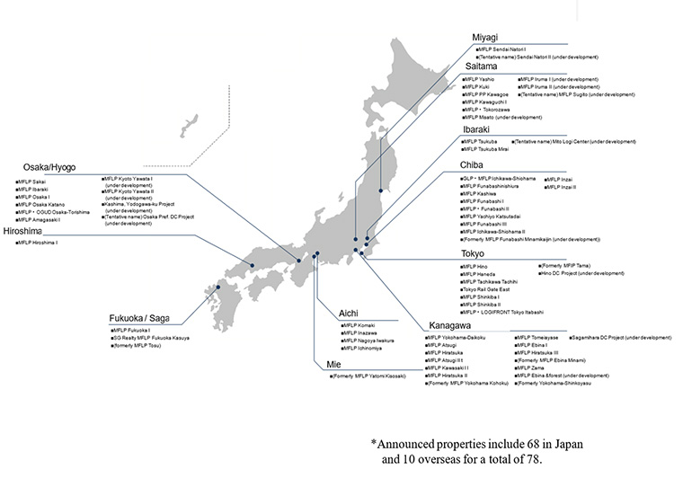 - Plan to start on six properties in fiscal 2025. Expanding the business to 78 facilities in Japan and overseas, total floor space of approximately 65,659,854 ft2 (6.10 million m2), and cumulative investment of ¥1.3000 trillion. Business to be steadily carried out going forward leveraging accumulated know-how and expertise.