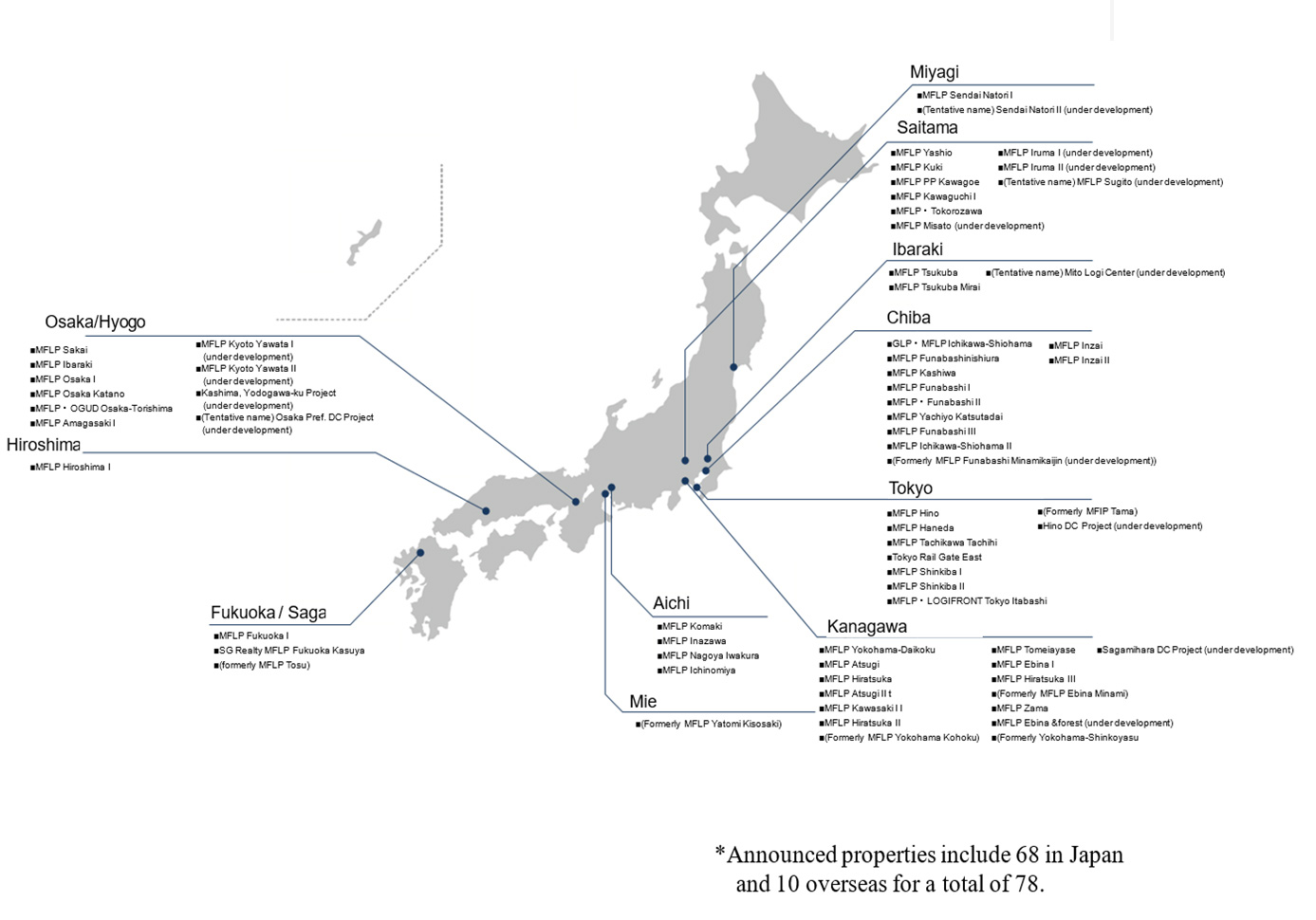 Number of properties | Domestic: 68 properties, Overseas: 10 properties, Total: 78 properties (Completed and operating facilities: Domestic: 54 properties, Overseas: 4 properties, Total: 58 properties) |