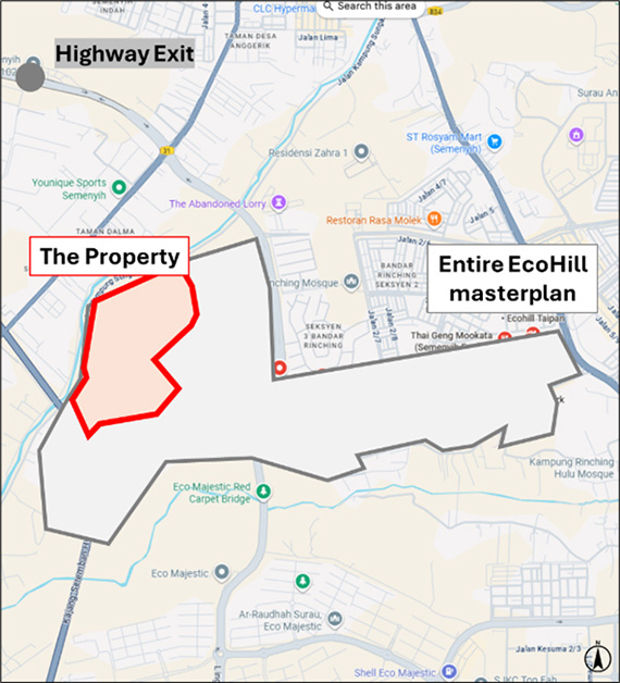 The Property is located in Semenyih district of Selangor, approximately 35 km south east of central Kuala Lumpur. Within the EcoHill master plan, amenities such as the Setia EcoHill Mall and an international school — both operated by SP Setia — are already in operation, providing high level of daily convenience. A direct access road to the highway has also been developed by S P Setia to ensure smooth access, and the area is expected to see further development and growth in the near future.