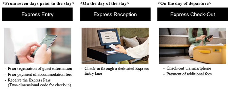 This service enables guests to register their address and passport information and complete online payment of room charges and accommodation tax before arriving at their hotel. Furthermore, guests can use the dedicated check-in terminal Express Reception (*3) and check out with their smartphones with Express Check-Out (*4, 5) for smoother and more stress-free lodging if they complete their check-in procedures in advance with Express Entry.