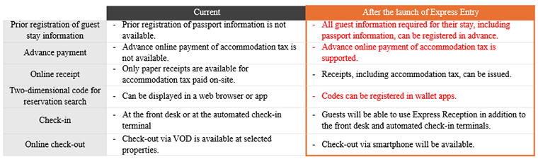 Currently, using advance QR check-in or booking websites enables guests to register a certain amount of their information for their stay, make advance payments, and receive online receipts. However, the introduction of Express Entry will substantially enhance services by enabling prior registration of all required guest information, including passport details, advance online payment of accommodation fees, including accommodation tax, issuance of online receipts, and registration of the wallet app, which enables QR code(*9) searches for reservations.