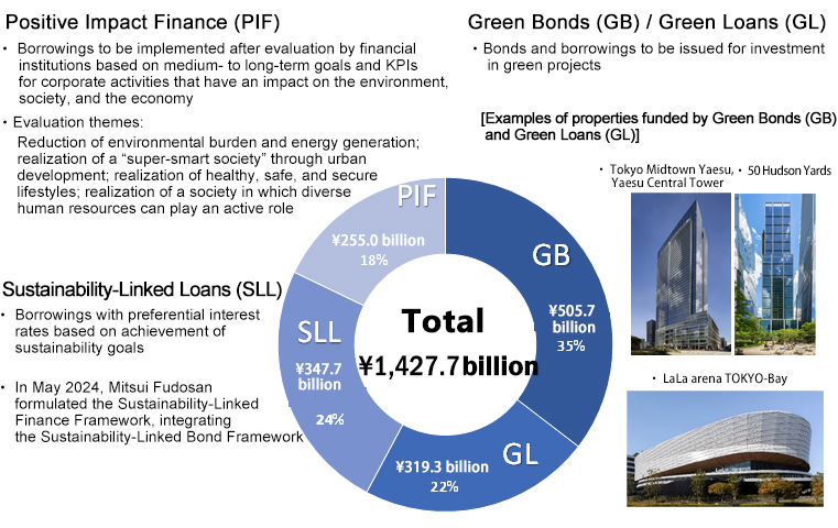 The Company has procured funds through a variety of sustainable finance methods, including the issuance of green bonds totaling ¥230.0 billion in FY2023 and ¥30.0 billion in FY2024, as well as green loans, sustainability-linked loans, and positive impact finance. As of the end of December 2025, the cumulative total procured by Mitsui Fudosan through sustainable finance activities was ¥1,427.7 billion. Furthermore, Mitsui Fudosan issued green bonds of ¥100.0 billion in May 2025 and ¥18.8 billion in October 2025.