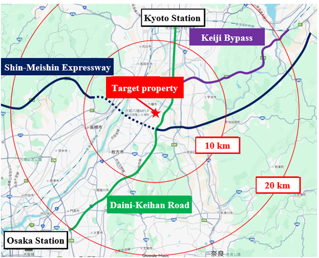 With its strategic location connecting Kyoto, Osaka, and Kobe, this Facility is a logistics hub built to manage a wide delivery area covering the entire Kansai region. More specifically, it is approximately 3.7 km from the Kyotanabe-Matsui Interchange on the Daini-Keihan Road and approximately 2.8 km from the Yawata Kyotanabe Interchange on the Shin-Meishin Expressway. Additionally, accessibility to Nagoya and Kobe will be enhanced when the remaining sections of the Shin-Meishin Expressway are completed in the future. After its completion, the Facility is expected to play an even more important role as the Kansai hub that connects east and west.