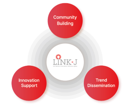 LINK-J has formulated its Vision and Mission for the next 10 years. To realize its Vision, LINK-J will expand the circle of co-creation by fostering highly specialized communities and promoting cooperation among diverse stakeholders, centering its activities on the three pillars of its Mission: “Community Building,” “Trend Dissemination,” and “Innovation Support.”